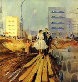 Это настроение он постарался передать в картине «Свадьба на завтрашней улице». По дощатому настилу идет пара молодоженов — невеста в белоснежном платье и легких туфлях и жених в черном костюме с букетом в руках. За ними по ухабам движется процессия, состоящая из их друзей и близких. Вдали видны трубы завода, чуть ближе — подъемные краны, машины, возвышаются белые корпуса новых домов, кое-где видны люди — не то рабочие, не то жители этой будущей улицы. Все они как будто замерли, приветствуя новую семью, движущуюся на зрителя.