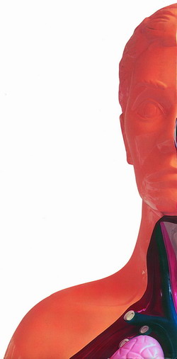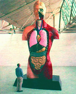 Повод для его создания был вполне прозаический. Сын художника пришел из школы с пластмассовой фигуркой наполовину вскрытого мужского торса — анатомическим пособием для изучения строения человеческого тела. Хёрст вдохновился и изваял точную копию этой фигурки, только шестиметрового роста, то есть высотой с двухэтажный дом. (Кстати, впоследствии ему пришлось договариваться в фирмой-изготовителем наглядных пособий, чтобы избежать судебного преследования за нарушение авторских прав.) Теперь каждый посетитель, оказавшись в центральном зале галереи Саатчи в Лондоне, упирается в эту огромную скульптуру, торжественно названную автором «Гимн».