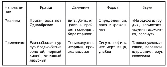 4. После завершения работы в группах идет обсуждение. Ученики читатют стихотворение вслух, затем сравнивают художественные подходы поэта-реалиста и поэта-символиста. В результате получается приблизительно такая таблица, которую совместно с педагогом заполняют ученики (см. табл.).